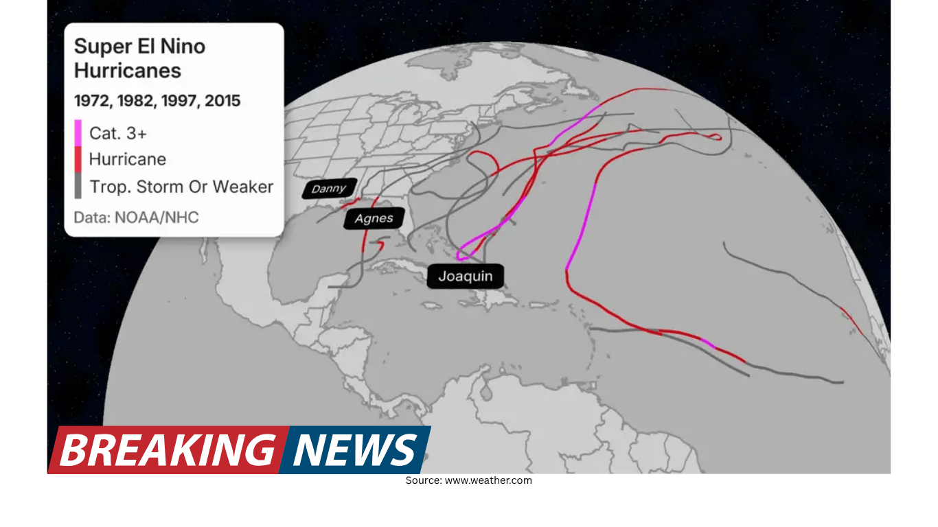 El Niño is a recurring climate pattern that can influence global weather. In the Atlantic basin, history shows that years described as “super” El Niño years have seen far fewer hurricanes develop than years that are not defined that way. That historical relationship is part of why a strong El Niño forecast is frequently paired with expectations for reduced hurricane activity.